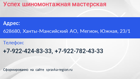 Успех, шиномонтажная мастерская по адресу 628680, Ханты-Мансийский АО, Мегион, Южная, 23/1 в дальнейшем Организация, размещена в следующих категориях: