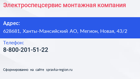 Электроспецсервис, монтажная компания по адресу 628681, Ханты-Мансийский АО, Мегион, Новая, 43/2 в дальнейшем Организация, размещена в следующих категориях: