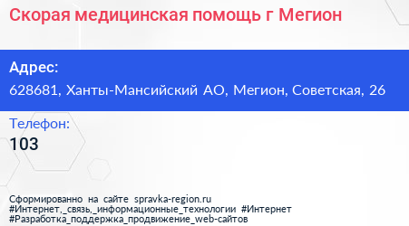 Скорая медицинская помощь, г. Мегион по адресу 628681, Ханты-Мансийский АО, Мегион, Советская, 26 в дальнейшем Организация, размещена в следующих категориях: