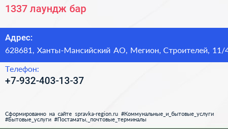 1337, лаундж-бар по адресу 628681, Ханты-Мансийский АО, Мегион, Строителей, 11/4 в дальнейшем Организация, размещена в следующих категориях: