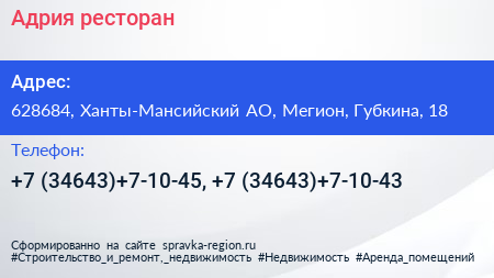 Адрия, ресторан по адресу 628684, Ханты-Мансийский АО, Мегион, Губкина, 18 в дальнейшем Организация, размещена в следующих категориях:
