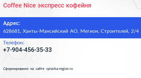 Coffee Nice, экспресс-кофейня по адресу 628681, Ханты-Мансийский АО, Мегион, Строителей, 2/4 в дальнейшем Организация, размещена в следующих категориях: