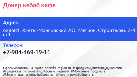 Донер кебаб, кафе по адресу 628681, Ханты-Мансийский АО, Мегион, Строителей, 2/4 ст1 в дальнейшем Организация, размещена в следующих категориях: