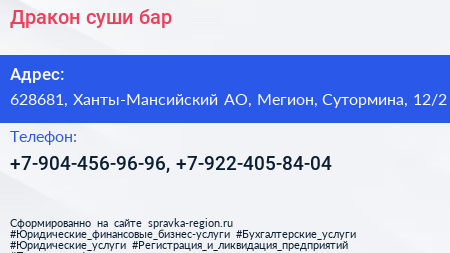 Дракон, суши-бар по адресу 628681, Ханты-Мансийский АО, Мегион, Сутормина, 12/2 в дальнейшем Организация, размещена в следующих категориях: