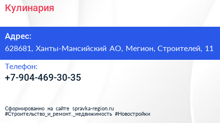 Кулинария по адресу 628681, Ханты-Мансийский АО, Мегион, Строителей, 11 в дальнейшем Организация, размещена в следующих категориях: