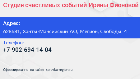 Студия счастливых событий Ирины Фионовой по адресу 628681, Ханты-Мансийский АО, Мегион, Свободы, 4 в дальнейшем Организация, размещена в следующих категориях: