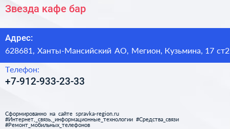 Звезда, кафе-бар по адресу 628681, Ханты-Мансийский АО, Мегион, Кузьмина, 17 ст2 в дальнейшем Организация, размещена в следующих категориях: