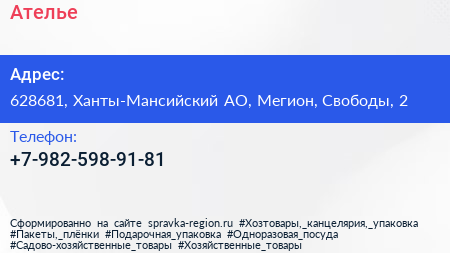 Ателье по адресу 628681, Ханты-Мансийский АО, Мегион, Свободы, 2 в дальнейшем Организация, размещена в следующих категориях: