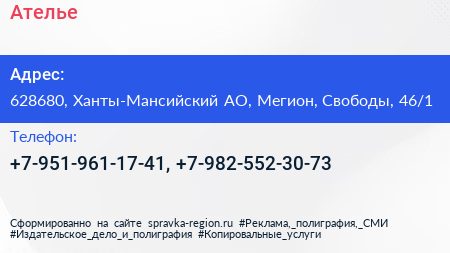 Ателье по адресу 628680, Ханты-Мансийский АО, Мегион, Свободы, 46/1 в дальнейшем Организация, размещена в следующих категориях: