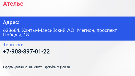 Ателье по адресу 628684, Ханты-Мансийский АО, Мегион, проспект Победы, 18 в дальнейшем Организация, размещена в следующих категориях: