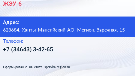 ЖЭУ-6 по адресу 628684, Ханты-Мансийский АО, Мегион, Заречная, 15 в дальнейшем Организация, размещена в следующих категориях: