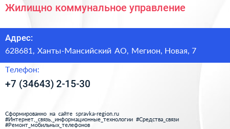 Жилищно-коммунальное управление по адресу 628681, Ханты-Мансийский АО, Мегион, Новая, 7 в дальнейшем Организация, размещена в следующих категориях: