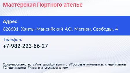 Мастерская Портного, ателье по адресу 628681, Ханты-Мансийский АО, Мегион, Свободы, 4 в дальнейшем Организация, размещена в следующих категориях: