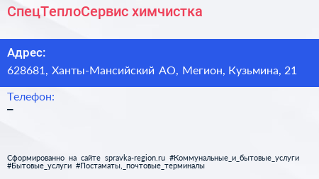 СпецТеплоСервис, химчистка по адресу 628681, Ханты-Мансийский АО, Мегион, Кузьмина, 21 в дальнейшем Организация, размещена в следующих категориях: