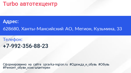 Turbo, автотехцентр по адресу 628680, Ханты-Мансийский АО, Мегион, Кузьмина, 33 в дальнейшем Организация, размещена в следующих категориях: