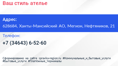 Ваш стиль, ателье по адресу 628684, Ханты-Мансийский АО, Мегион, Нефтяников, 21 в дальнейшем Организация, размещена в следующих категориях: