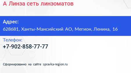 А-Линза, сеть линзоматов по адресу 628681, Ханты-Мансийский АО, Мегион, Ленина, 16 в дальнейшем Организация, размещена в следующих категориях: