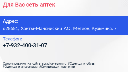 Для Вас, сеть аптек по адресу 628681, Ханты-Мансийский АО, Мегион, Кузьмина, 7 в дальнейшем Организация, размещена в следующих категориях: