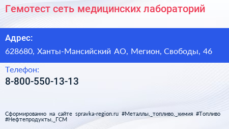 Гемотест, сеть медицинских лабораторий по адресу 628680, Ханты-Мансийский АО, Мегион, Свободы, 46 в дальнейшем Организация, размещена в следующих категориях: