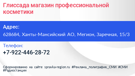Глиссада, магазин профессиональной косметики по адресу 628684, Ханты-Мансийский АО, Мегион, Заречная, 15/3 в дальнейшем Организация, размещена в следующих категориях: