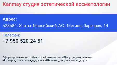 Kanmay, студия эстетической косметологии по адресу 628684, Ханты-Мансийский АО, Мегион, Заречная, 14 в дальнейшем Организация, размещена в следующих категориях: