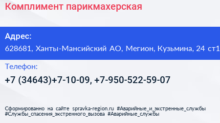 Комплимент, парикмахерская по адресу 628681, Ханты-Мансийский АО, Мегион, Кузьмина, 24 ст1 в дальнейшем Организация, размещена в следующих категориях: