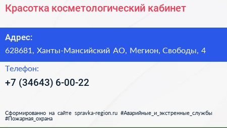 Красотка, косметологический кабинет по адресу 628681, Ханты-Мансийский АО, Мегион, Свободы, 4 в дальнейшем Организация, размещена в следующих категориях: