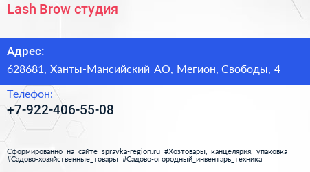 Lash & Brow, студия по адресу 628681, Ханты-Мансийский АО, Мегион, Свободы, 4 в дальнейшем Организация, размещена в следующих категориях: