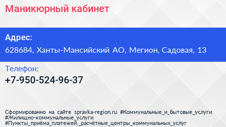 Маникюрный кабинет по адресу 628684, Ханты-Мансийский АО, Мегион, Садовая, 13 в дальнейшем Организация, размещена в следующих категориях: