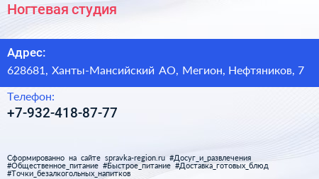 Ногтевая студия по адресу 628681, Ханты-Мансийский АО, Мегион, Нефтяников, 7 в дальнейшем Организация, размещена в следующих категориях: