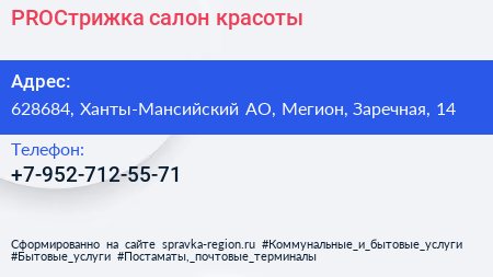 PROCтрижка, салон красоты по адресу 628684, Ханты-Мансийский АО, Мегион, Заречная, 14 в дальнейшем Организация, размещена в следующих категориях: