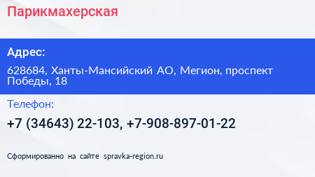 Парикмахерская по адресу 628684, Ханты-Мансийский АО, Мегион, проспект Победы, 18 в дальнейшем Организация, размещена в следующих категориях: