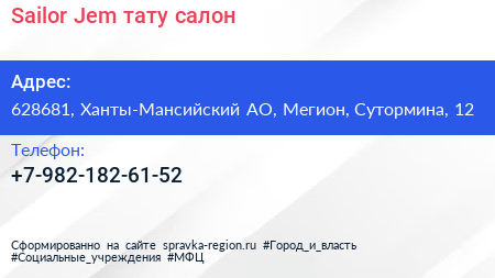 Sailor Jem, тату-салон по адресу 628681, Ханты-Мансийский АО, Мегион, Сутормина, 12 в дальнейшем Организация, размещена в следующих категориях: