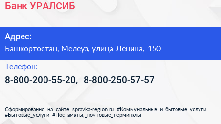 Банк УРАЛСИБ по адресу Башкортостан, Мелеуз, улица Ленина, 150 в дальнейшем Организация, размещена в следующих категориях: