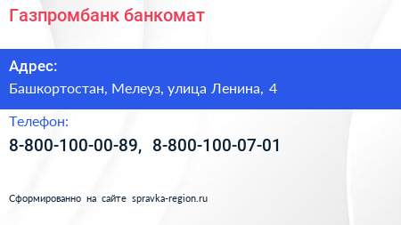 Газпромбанк, банкомат по адресу Башкортостан, Мелеуз, улица Ленина, 4 в дальнейшем Организация, размещена в следующих категориях: