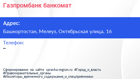 Газпромбанк, банкомат по адресу Башкортостан, Мелеуз, Октябрьская улица, 16 в дальнейшем Организация, размещена в следующих категориях: