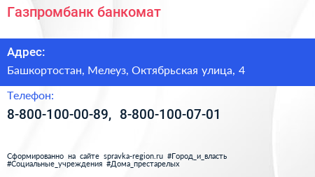 Газпромбанк, банкомат по адресу Башкортостан, Мелеуз, Октябрьская улица, 4 в дальнейшем Организация, размещена в следующих категориях:
