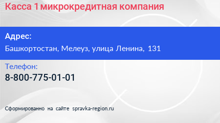 Касса №1, микрокредитная компания по адресу Башкортостан, Мелеуз, улица Ленина, 131 в дальнейшем Организация, размещена в следующих категориях:
