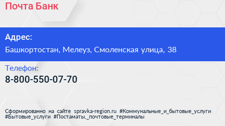 Почта Банк по адресу Башкортостан, Мелеуз, Смоленская улица, 38 в дальнейшем Организация, размещена в следующих категориях: