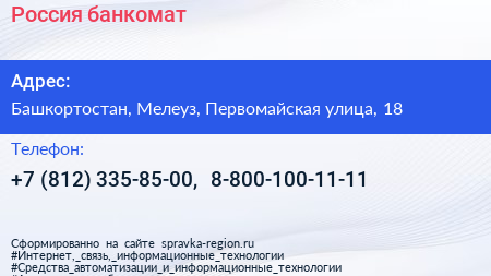 Россия, банкомат по адресу Башкортостан, Мелеуз, Первомайская улица, 18 в дальнейшем Организация, размещена в следующих категориях: