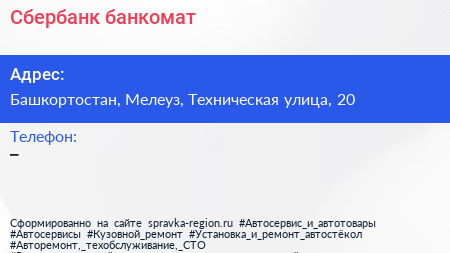 Сбербанк, банкомат по адресу Башкортостан, Мелеуз, Техническая улица, 20 в дальнейшем Организация, размещена в следующих категориях: