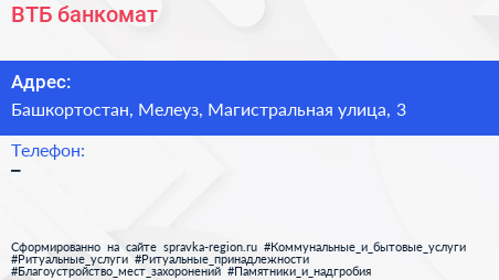 ВТБ, банкомат по адресу Башкортостан, Мелеуз, Магистральная улица, 3 в дальнейшем Организация, размещена в следующих категориях: