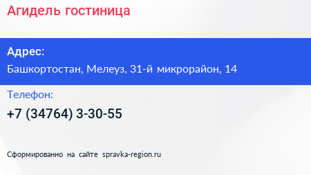 Агидель, гостиница по адресу Башкортостан, Мелеуз, 31-й микрорайон, 14 в дальнейшем Организация, размещена в следующих категориях: