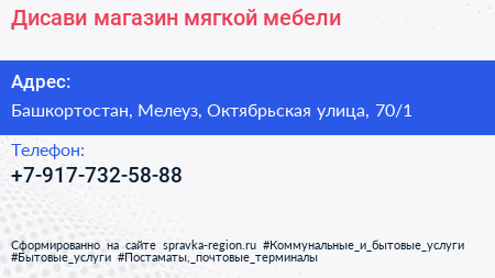 Дисави, магазин мягкой мебели по адресу Башкортостан, Мелеуз, Октябрьская улица, 70/1 в дальнейшем Организация, размещена в следующих категориях: