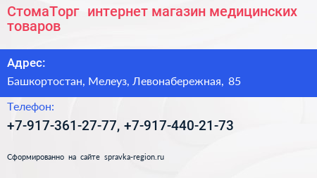 СтомаТорг+, интернет-магазин медицинских товаров по адресу Башкортостан, Мелеуз, Левонабережная, 85 в дальнейшем Организация, размещена в следующих категориях: