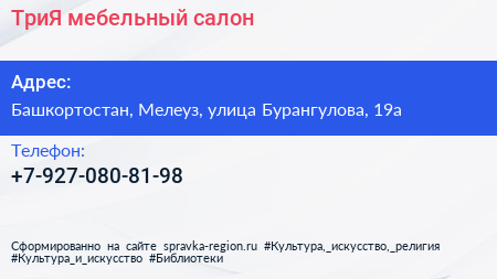 ТриЯ, мебельный салон по адресу Башкортостан, Мелеуз, улица Бурангулова, 19а в дальнейшем Организация, размещена в следующих категориях: