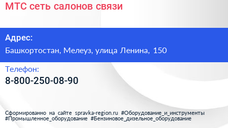 МТС, сеть салонов связи по адресу Башкортостан, Мелеуз, улица Ленина, 150 в дальнейшем Организация, размещена в следующих категориях: