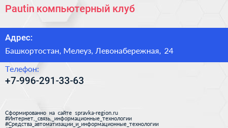 Pautin, компьютерный клуб по адресу Башкортостан, Мелеуз, Левонабережная, 24 в дальнейшем Организация, размещена в следующих категориях: