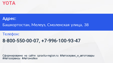 YOTA по адресу Башкортостан, Мелеуз, Смоленская улица, 38 в дальнейшем Организация, размещена в следующих категориях: