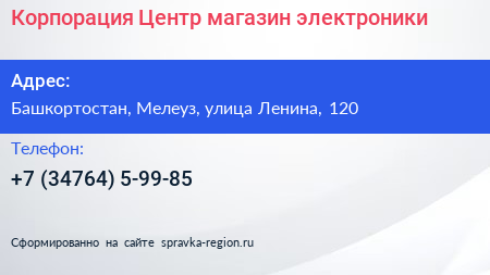 Корпорация Центр, магазин электроники по адресу Башкортостан, Мелеуз, улица Ленина, 120 в дальнейшем Организация, размещена в следующих категориях: